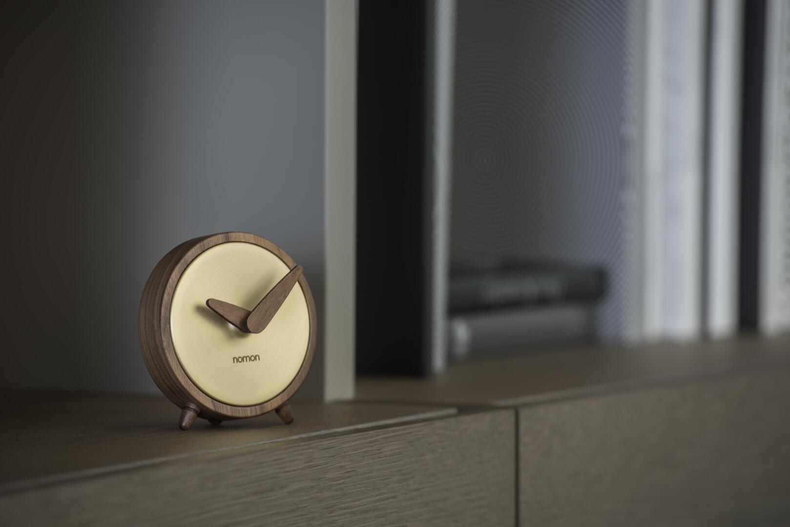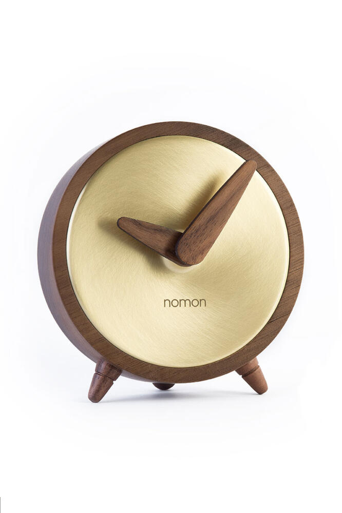Die Atomo Sobremesa, eine klassische Tischuhr aus der Kollektion Nomon von Barcelona. Die handgefertigte Tischuhr aus Nussbaumholz kann mit einem titan oder goldenem Zifferblatt bestellt werden.