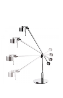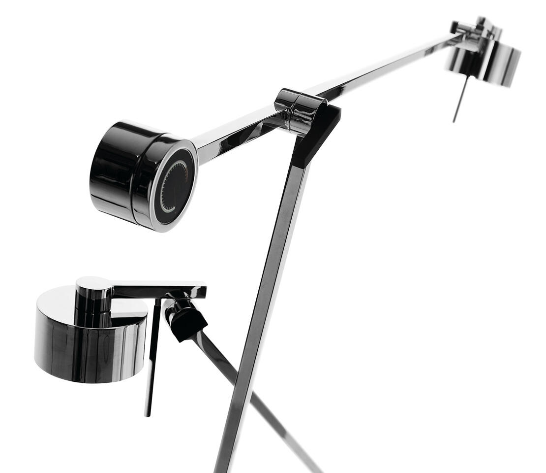Essentielle und strenge Formen definieren den Fluss des Lichts mit Intensität und Präzision. Dank der Einfachheit klarer Details und funktionaler Oberflächen beleuchtet die ax20 die Eleganz des Designs. Die sich mit glänzendem Chromfinish zeigende Axolight ax20 Stehleuchte ist eine in jeglicher Hinsicht überzeugende Funktionsleuchte mit exklusivem Appeal. Die natürlich dimmbare Leuchte kann auf dem Rundsockel um 180 Grad gedreht, am Ausleger um 100 Grad geschwenkt und am Schirm und ebenfalls 100 Grad gekippt werden.