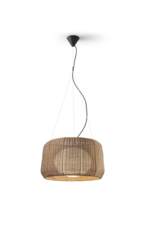Pendelleuchte Fora S FORA S ist eine stilvolle und elegante Pendelleuchte. Was vor allem durch den in mühevoller Handarbeit hergestellten Leuchtschirm erzielt wird, der aus einem witterungsbeständigen, synthetischen Korbgeflecht besteht. Kombiniert wurde dieser mit einer zierlichen, aber dennoch extravaganten Deckenhalterung. Der Leuchtschirm sorgt auch für eine angenehme sowie gleichmäßige Lichtstreuung. Eingeschaltet wie auch ausgeschaltet ziert FORA S nicht nur private Wohnräume und sorgt dort für mediterranes Flair, sondern auch Cafés oder Restaurants lassen sich mit ihr in atmosphärisches Licht tauchen.