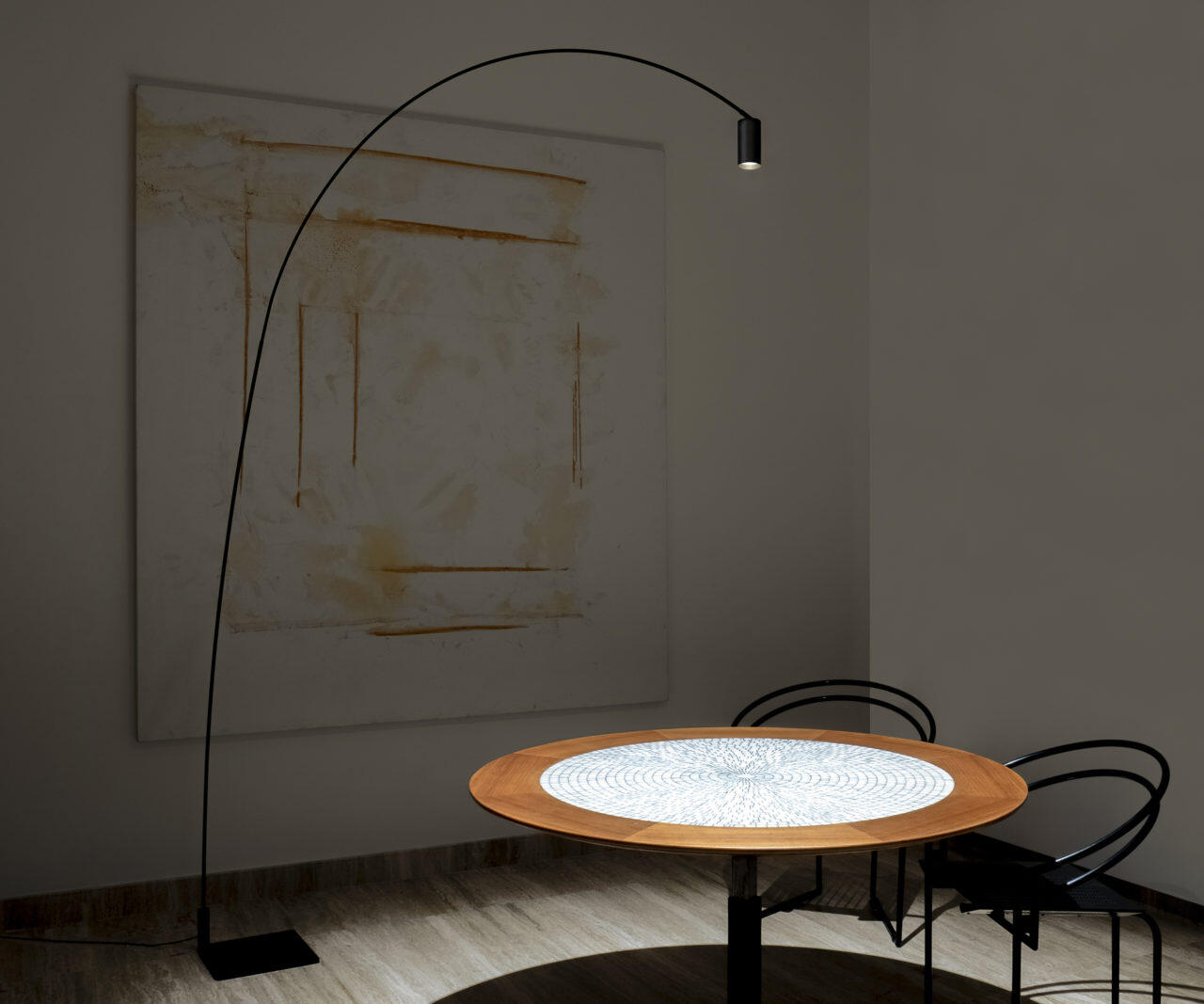 Fox „Alle meine Designs sind dynamisch, ich baue Bewegung, Flexibilität und Balance auf verschiedenen Ebenen spielerisch ein. Ich vereinfache die Objekte und reduziere den Materialeinsatz auf ein Minimum und lege damit diese Dynamik frei“ sagt der Designer Bernhard Osann. Und das trifft auch auf die Stehleuchte Fox zu, die er für Nemo entworfen hat.  Die dimmbare LED Leuchte aus mattem schwarzem Stahl hat einen schwenkbaren Bogen und einen verstellbaren zylindrischen Spot. Damit ermöglicht Fox die flexible Positionierung des warmen Lichtstrahls.