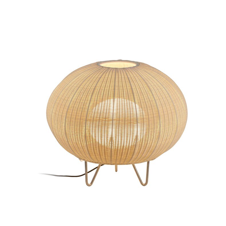 Sie hat einen Baldachin und Rahmen aus Aluminium und ist für den Aussenbereich geschaffen. Der runde Lampenschirm ist aus brauner oder elfenbeinfarbiger Kunstfaser geflochten, recyclebar und umweltverträglich.
