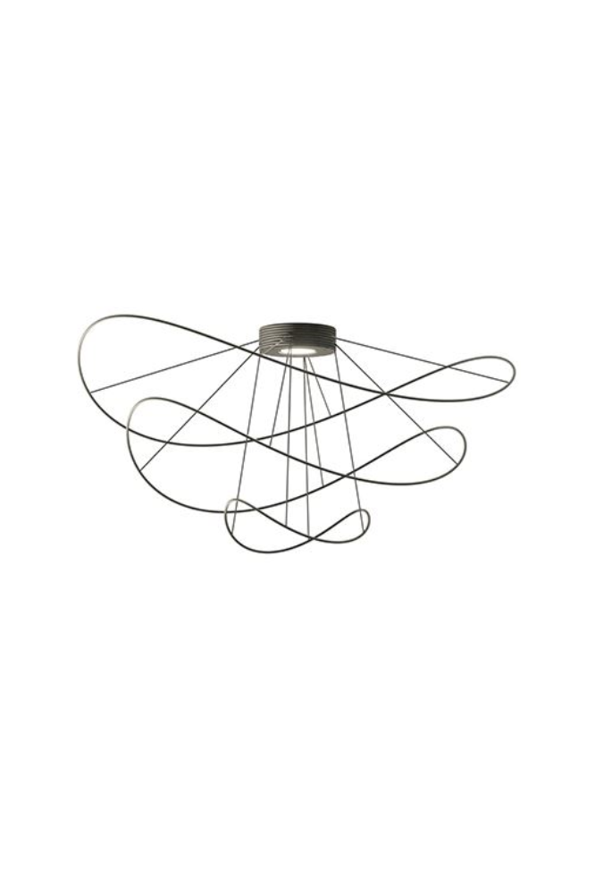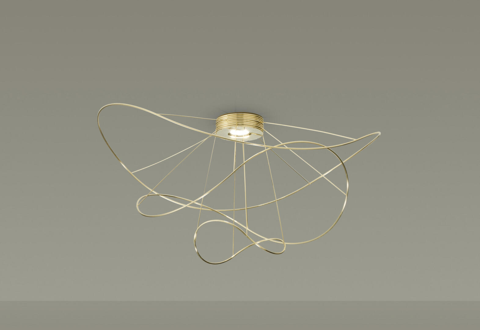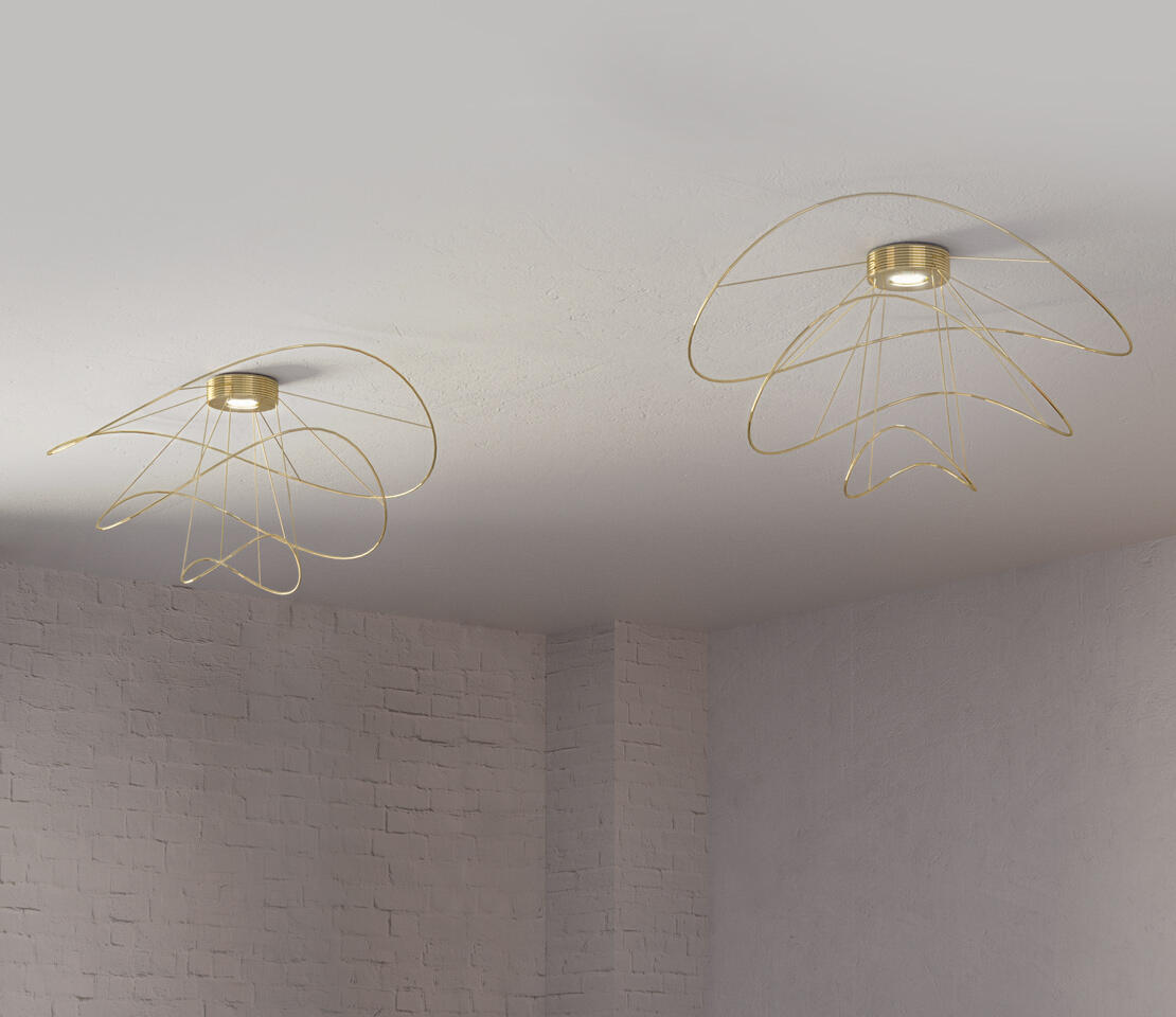 Kollektion bestehend aus Deckenleuchten und Hängeleuchten mit austauschbaren Elementen in verschiedenen Formen und Grössen. Erhältlich ist in 3 Farb-Ausführung: Gold, Schwarz oder Weiss. Eingebaute – dimmbare LED-Lichtquelle.