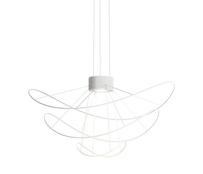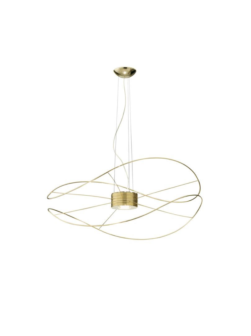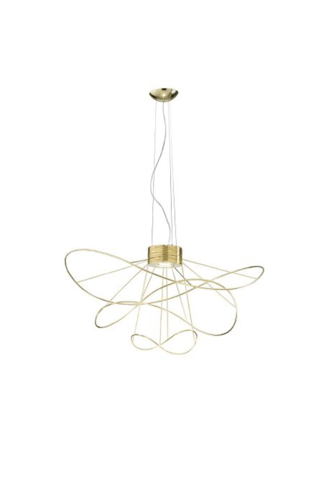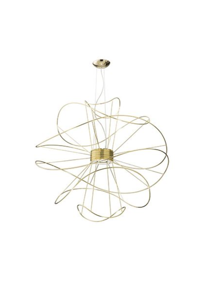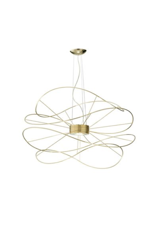 Hoops Pendelleuchte Linien, die schwelgerisch um einen Kern tanzen, in einem wechselnden Spiel aus reflektierten Formen und Licht. Die Schlangenartigen Form der Hoops ist ein dünner, wirbelnder Faden, dem die Augen folgen sollen. Kollektion bestehend aus Deckenleuchten und Hängeleuchten mit austauschbaren Elementen in verschiedenen Formen und Grössen. Erhältlich ist in 3 Farb-Ausführung: Gold, Schwarz oder Weiss. Eingebaute - dimmbare LED-Lichtquelle. Die Pendelleuchte kann nach oben und nach unten leuchten.