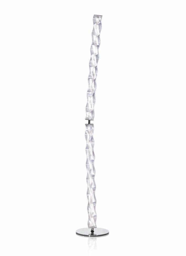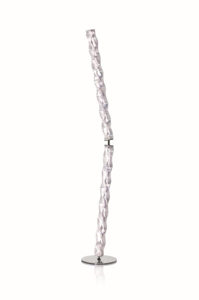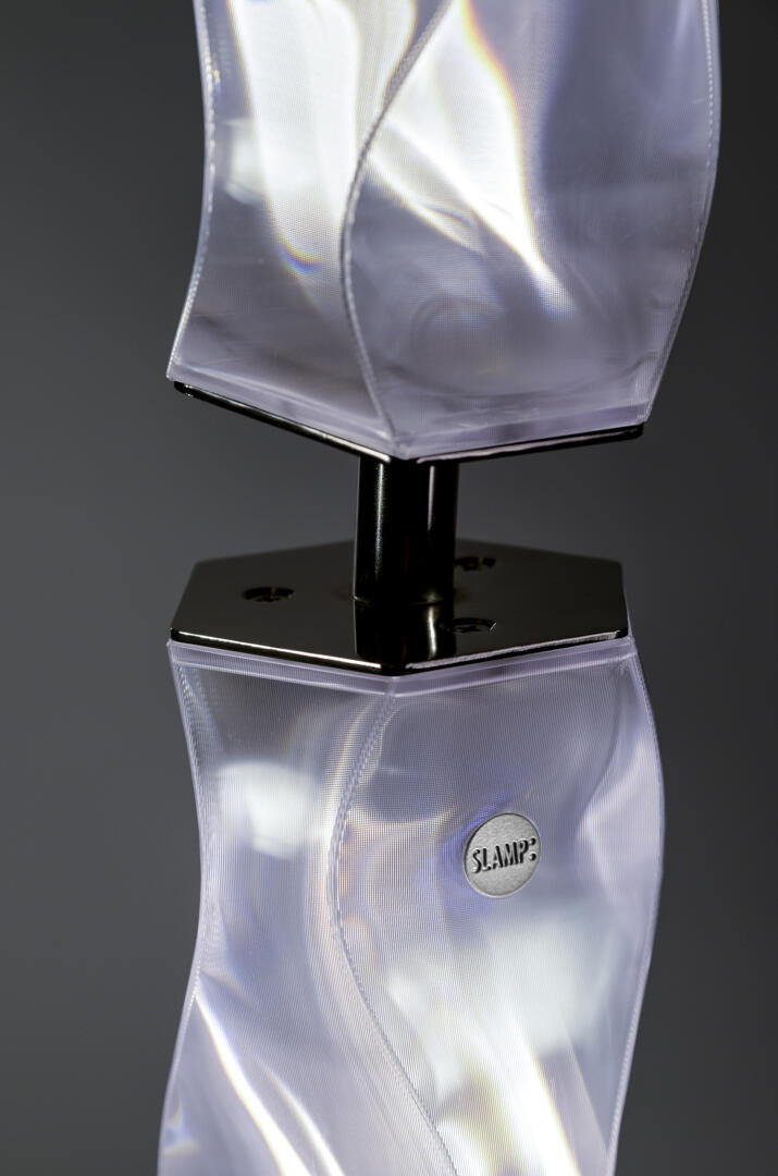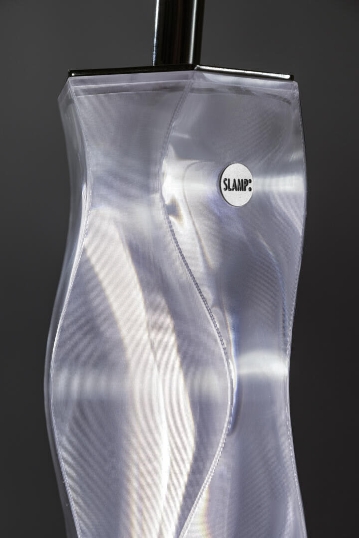 Fest oder flüssig: Magie durch die Verwendung von unsichtbaren Stahlskeletten, die von einer Muskulatur aus Lentiflex® umhüllt sind, dem innovativen Material von Slamp, das LED-Beleuchtung verflüssigt. Es dämpft und gleicht das Licht aus, sodass das Modul im Raum zu schweben scheint. Die Neigung und das Design der Stehlampe sind von den Handbewegungen der Hauptfiguren in Michelangelos Gemälde Das Jüngste Gericht in der Sixtinischen Kapelle inspiriert.