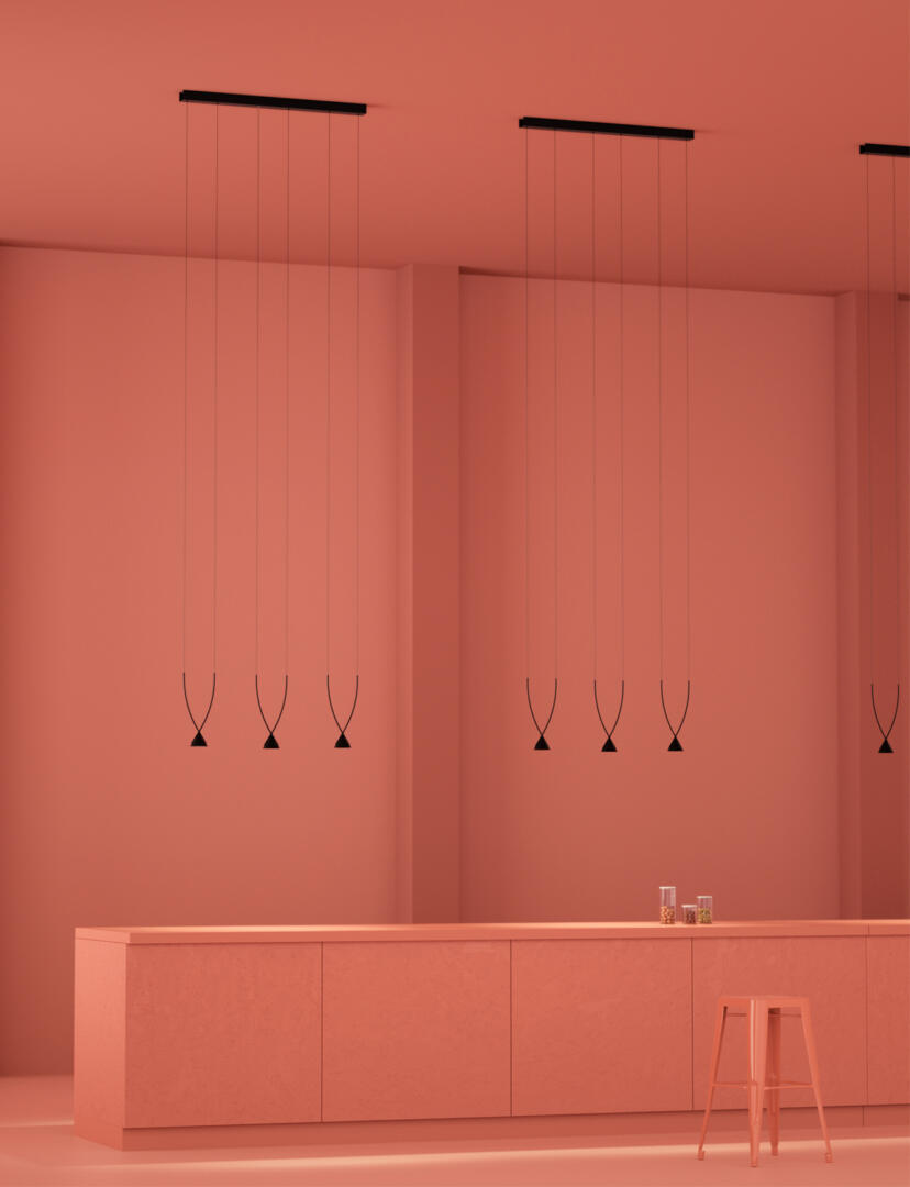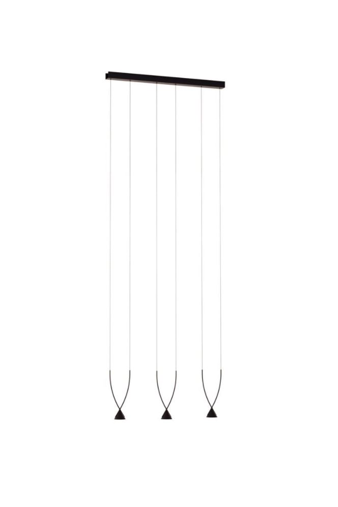 Aluminium-Hängeleuchten mit Glas gefülltem Nylonbogen, hergestellt aus recycelten Materialien. Erhältlich in vier Konfigurationen in schwarzer Farbe. Eingebautes dimmbares LED-Leuchtmittel.