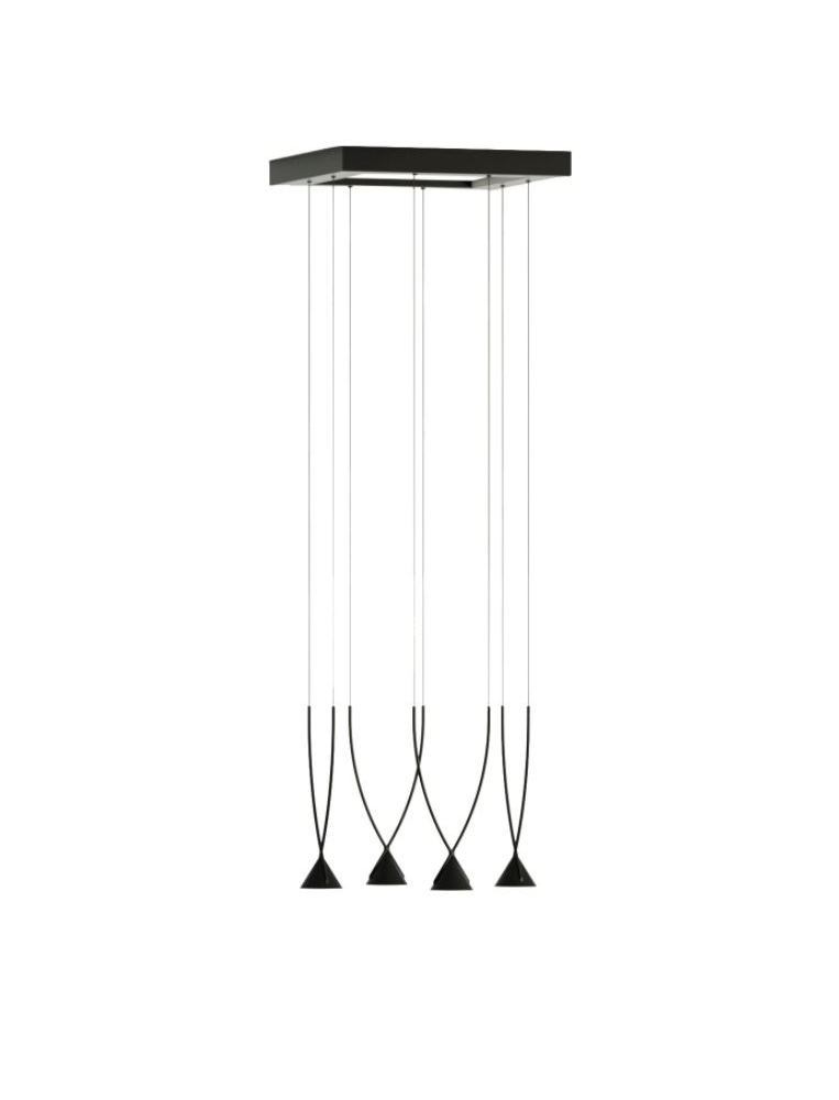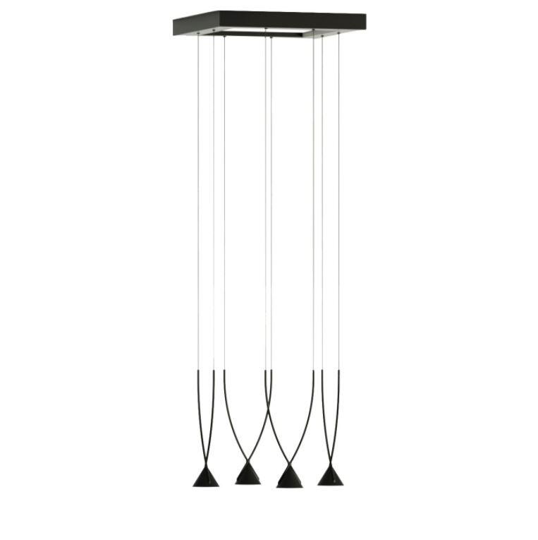 Aluminium-Hängeleuchten mit Glas gefülltem Nylonbogen, hergestellt aus recycelten Materialien. Erhältlich in vier Konfigurationen in schwarzer Farbe. Eingebautes dimmbares LED-Leuchtmittel.