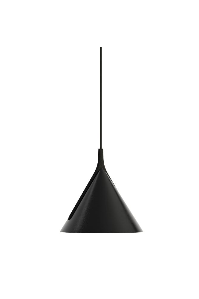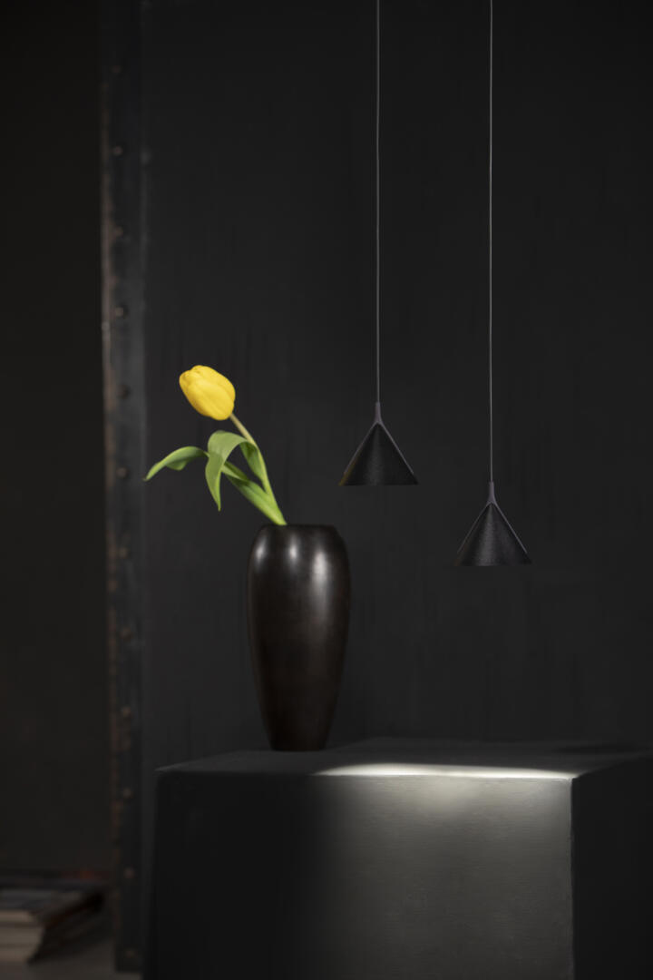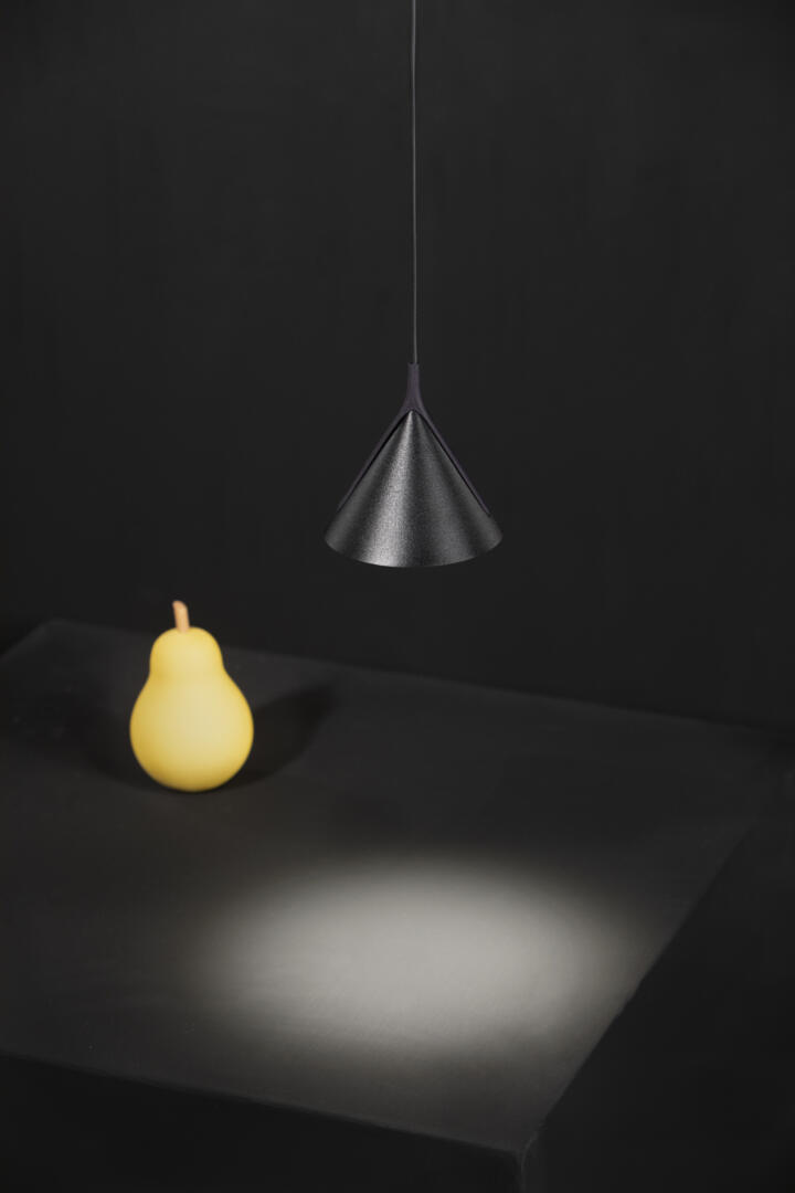 Aluminium-Hängeleuchten mit Glas gefülltem Nylonbogen, hergestellt aus recycelten Materialien. Verfügbar in 3 Farb-Ausführungen: Schwarz/Gold, Schwarz/Schwarz und Grau/Schwarz mit eingebautem dimmbarem LED-Leuchtmittel.