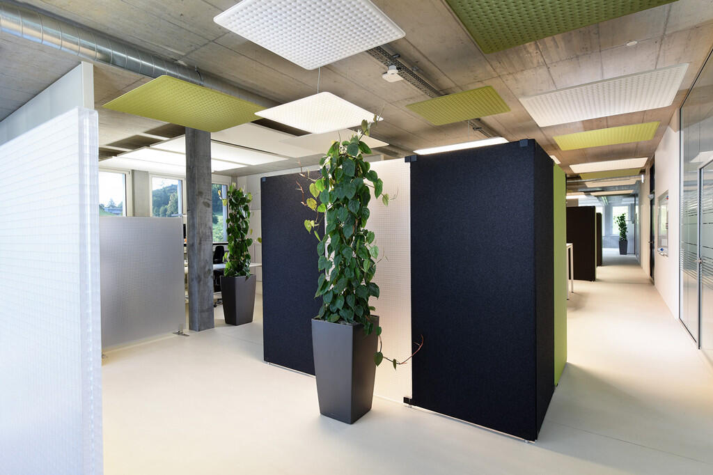 Die Leuchte gibt nicht nur Licht, sondern sie kann auch den Schall absorbieren. Die quadratische Leuchte besitzt die Schallabsorbationsklasse B.