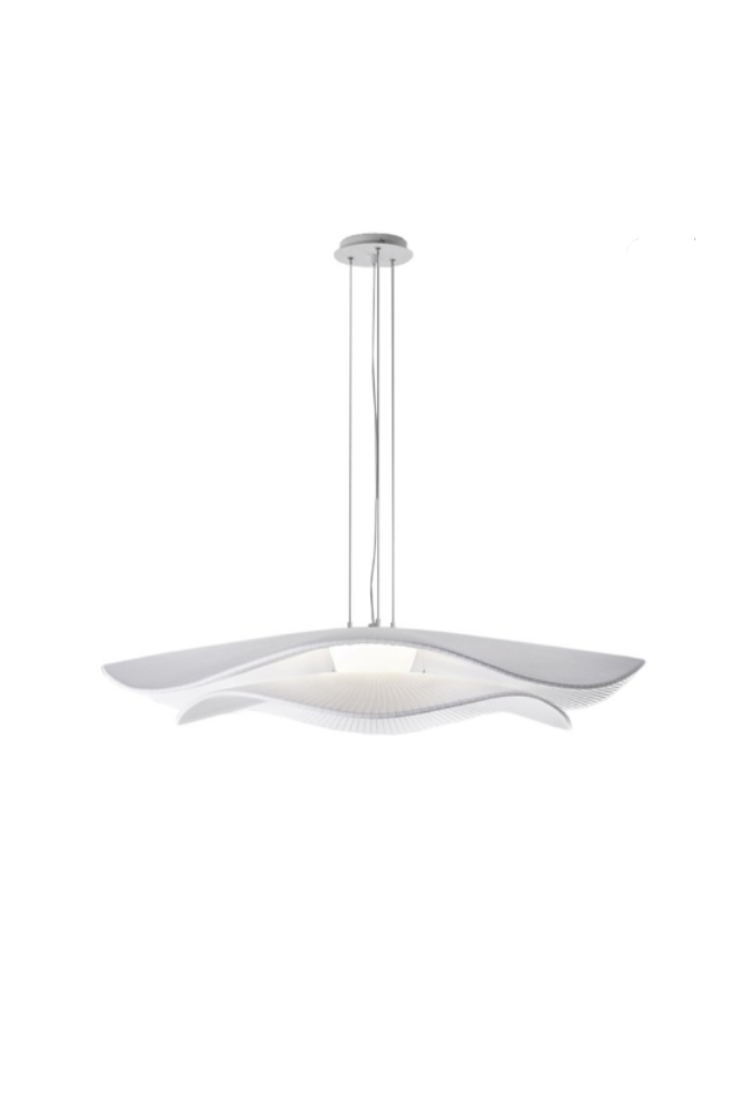 MEDITERRÀNIA ist ein wahrer Blickfang und eine Hommage an das Licht. Ihre Textilschirme mit geschwungenem Design erinnert an das Meer. Zwischen den Schirmen verbirgt sich ein fest integriertes LED-Leuchtmittel, dessen warmes Licht durch einen weissen Kunststoffdiffusor abgeblendet wird. Dadurch entstehen atmosphärische Lichtnuancen, die den weissen Stoff der Schirmen durchdringen. Dynamisch, modern und dennoch klassisch – so lässt sich diese Leuchte am besten beschreiben. MEDITERRÀNIA bereichert jede Umgebung mit schlichter Eleganz und einem Hauch mediterranem Lebensgefühl. Diese Leuchte ist auch mit einem Textilschirm erhältlich (siehe MEDITERRÀNIA S/105).