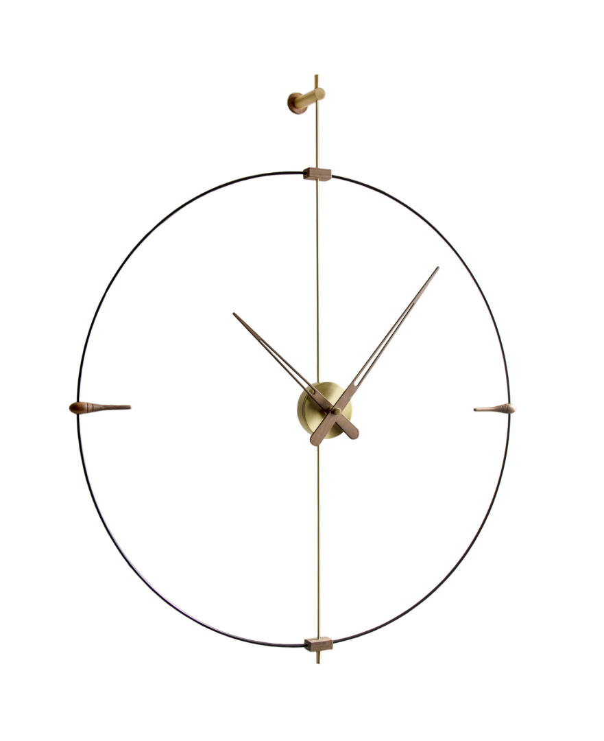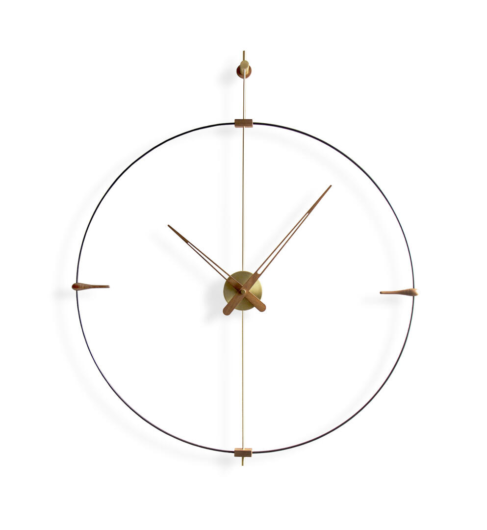Die Uhr gibt es in 2 Varianten: Einerseits schwarz lackierte Holzzeiger und Details aus Nussbaum, anderseits Nussbaumzeiger, Details aus Nussbaum und Uhrenwerkbox aus gold.