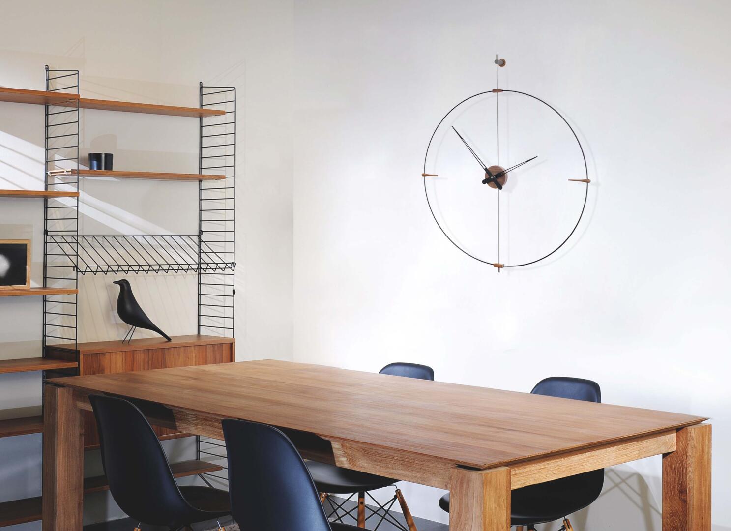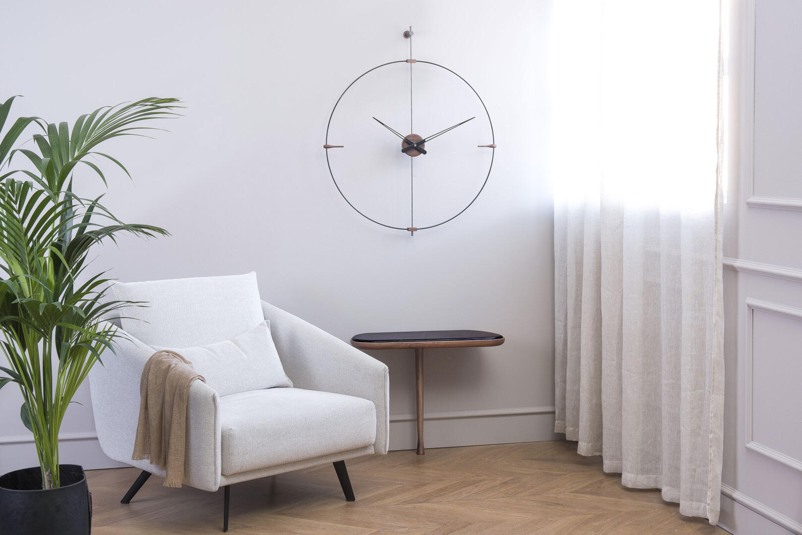 Die batteriebetriebene Uhr mit minimalistischem Design wird an einem einzigen Punkt an der Wand installiert.