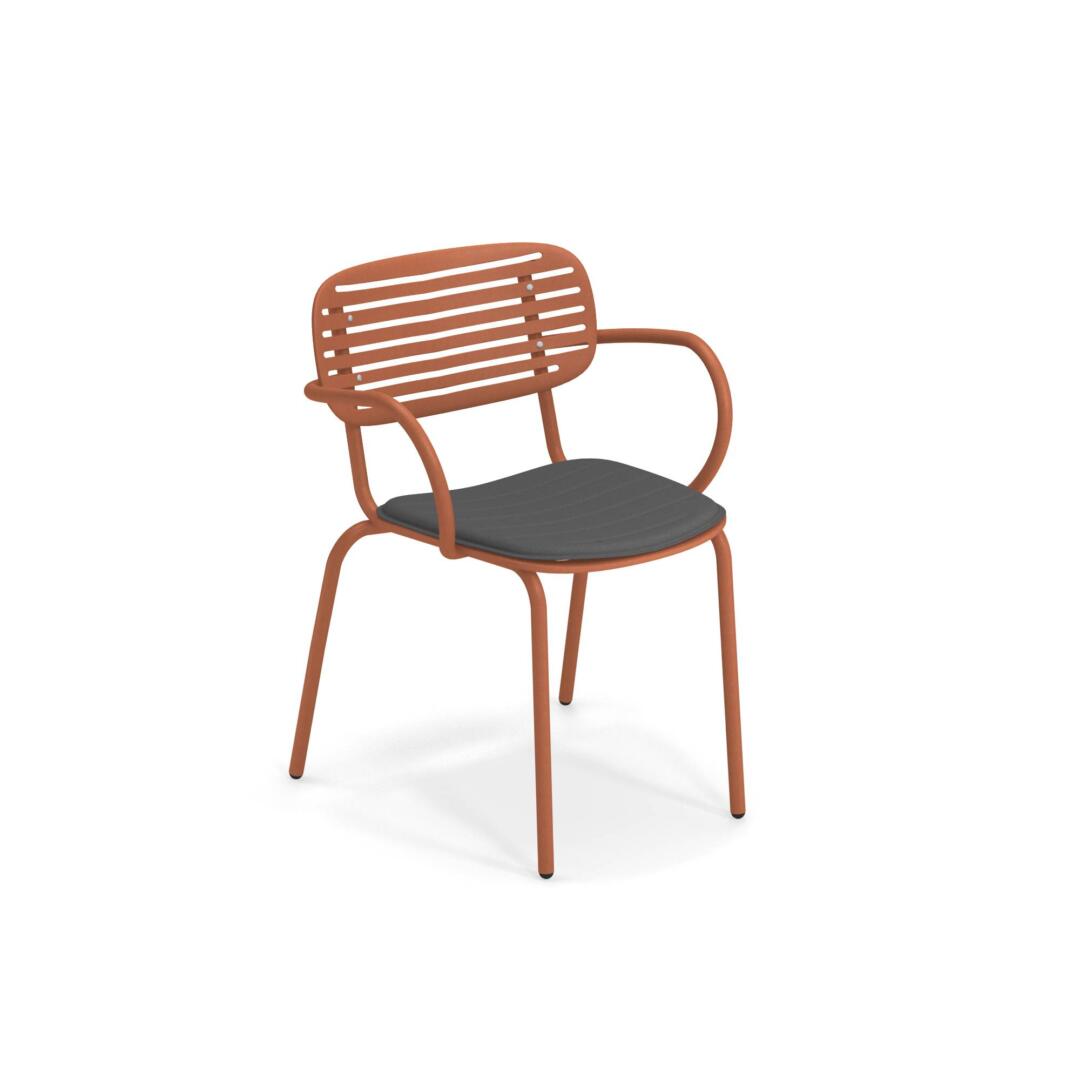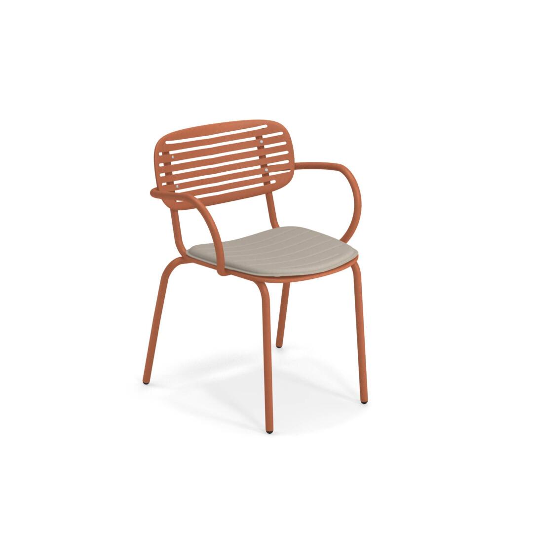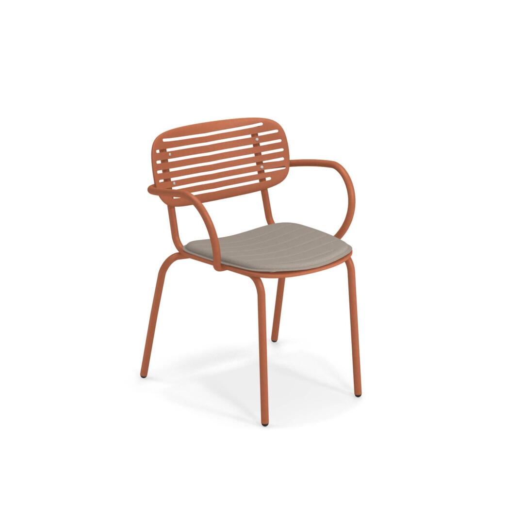 Die Kollektion Mom von Coirier wurde von den traditionellen japanischen Suiban Tabletts inspiriert. Die Struktur besteht komplett aus Stahlrohren Fe360, während die Sitzfläche und die Rückenlehne, die sich durch ein besonderes Design auszeichnen, aus tiefgezogenem verzinktem Stahlblech bestehen. Verarbeitung Emu-Coat (Kataphorese + Lackierung).