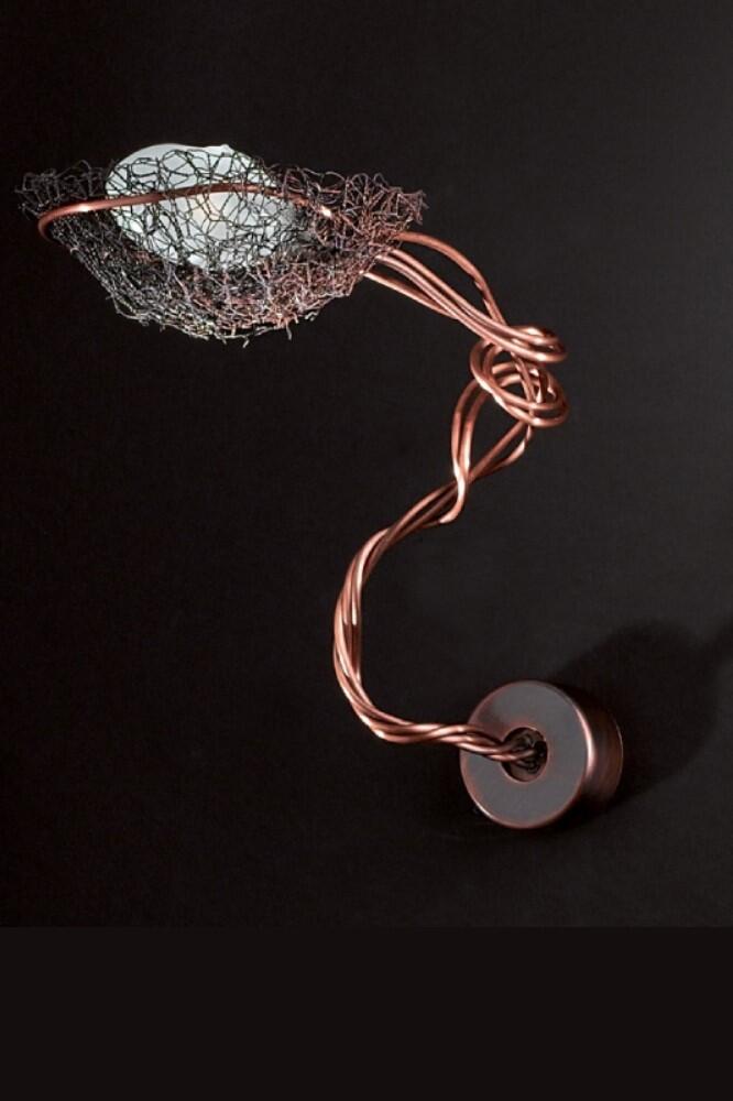 Nido ist eine handgefertigte Wandleuchte. Sie avanciert zu einem Blickfang. Die von Marco Pagnoncelli entworfene Leuchte ist aus stabilen Kupferdräten gefertigt, die sich in die gewünschte Position biegen lassen. An deren Ende liegt ein metallenes Gewinde, das in der Form an ein Nest erinnert, in dem eine leuchtende Kugel platziert ist, die darin zu schweben scheint. Diese besteht aus geblasenem Opalglas und sorgt für ein angenehm diffuses Licht. Nido ist in zwei verschiedenen Grössen erhältlich. Das passende Glühmittel legen wir Dir kostenlos dazu.