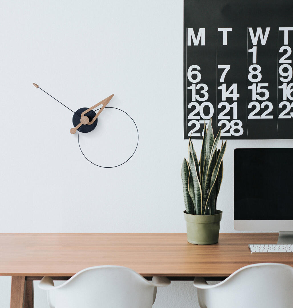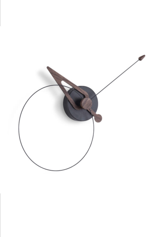 Die Pico, eine feine Wanduhr aus der Kollektion Nomon von Barcelona. Die Designuhr wirkt mit den Zeigern aus Nussbaumholz oder Eichenholz wie ein verspieltes Element an der Wand!