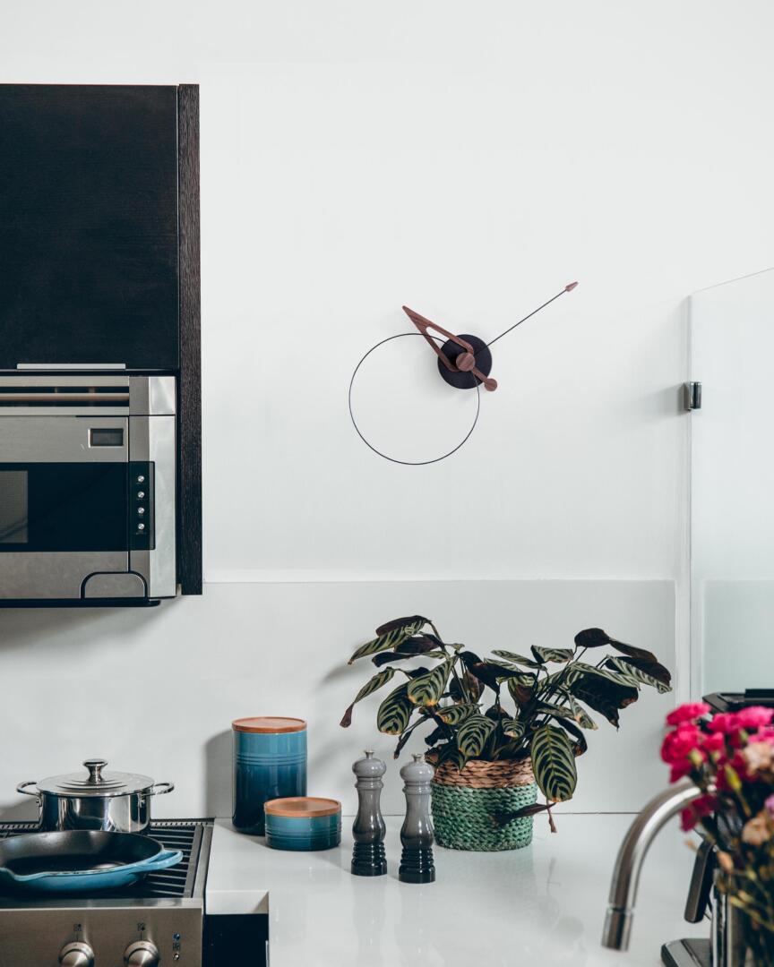 Die batteriebetriebene Uhr mit minimalistischem Design wird an einem einzigen Punkt an der Wand installiert.