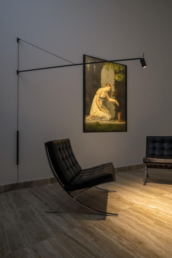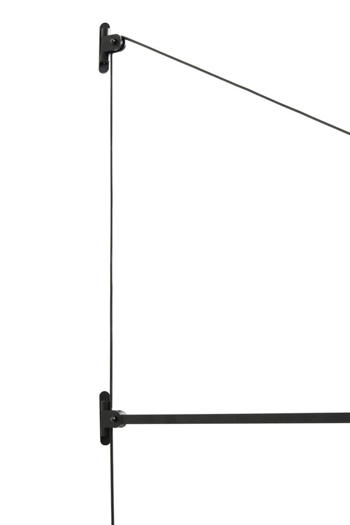 Swan SWAN ist eine dimmbare LED-Wandleuchte für direkte Beleuchtung. Die Struktur ist aus mattschwarz lackiertem Aluminium. Der Arm ist vertikal um 40° drehbar, gehalten durch ein ledernes Gegengewicht, und horizontal um 180° drehbar. Ihr richtbarer zylindrischer Kopf ermöglicht eine flexible Ausrichtung des Lichtstrahls, mit optionalem Wabenfilter für Blendschutz. Dimmer am Kabel.