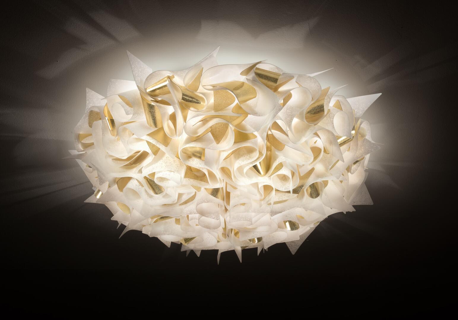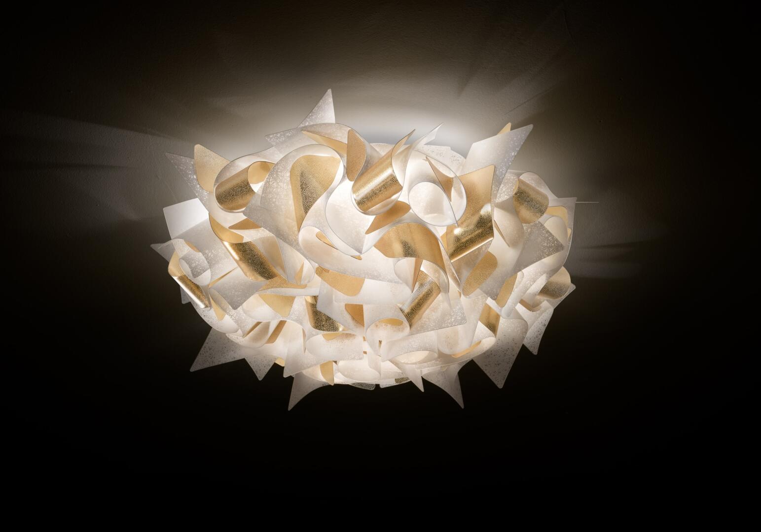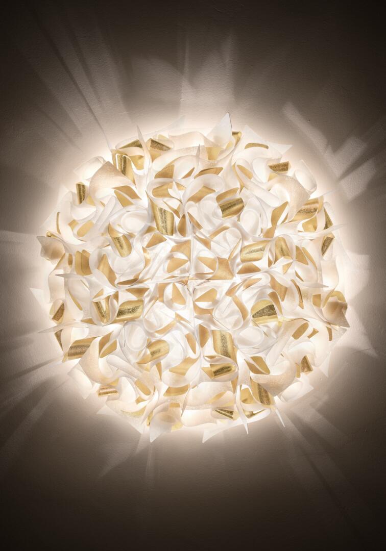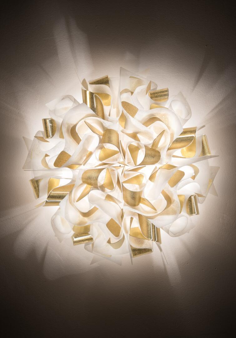 Veli Aurea Decken- und Wandleuchte Die Veli Aurea Decken- und Wandleuchten, eine Sonderedition zum 30. Jubiläum von Slamp, sind das Ergebnis des kreativen Geistes von Designer Adriano Rachele. Diese Leuchten sind mehr als nur Beleuchtung; sie sind ein Stück zeitgenössischer Kunst. Rachele beschreibt das Produkt als "Veli Aurea", den neuesten Zusatz zu einer ikonischen Kollektion von Lampen aus avantgardistischen Technopolymeren (Opalflex® and Lentiflex®). Sie zeichnen sich durch eine weisse Textur und goldene Lamellen-Akzente aus, die jedem Raum eine luxuriöse und warme Atmosphäre verleihen. Die Veli Aurea Leuchten kombinieren stilvolle Eleganz mit funktionaler Beleuchtung. Ihre einzigartige wellenförmige Gestaltung und die goldene Farbe bringen einen Hauch von Luxus in jede Umgebung. Hergestellt aus hochwertigen Materialien, sind diese Leuchten langlebig und vielseitig einsetzbar. Sie eignen sich sowohl als Decken- als auch als Wandleuchten und passen sich nahtlos an verschiedene Räume und Stile an. Ausgestattet mit moderner Beleuchtungstechnologie, sorgen die Veli Aurea Leuchten für ein gleichmässiges und blendfreies Licht, das eine angenehme Atmosphäre schafft. Ihre einfache Installation macht sie zu einer idealen Wahl für diejenigen, die ihr Zuhause mit stilvoller und effizienter Beleuchtung bereichern möchten. Mit der Veli Aurea kannst du deinem Raum mit der perfekten Mischung aus Innovation und zeitlosem Design erleuchten.
