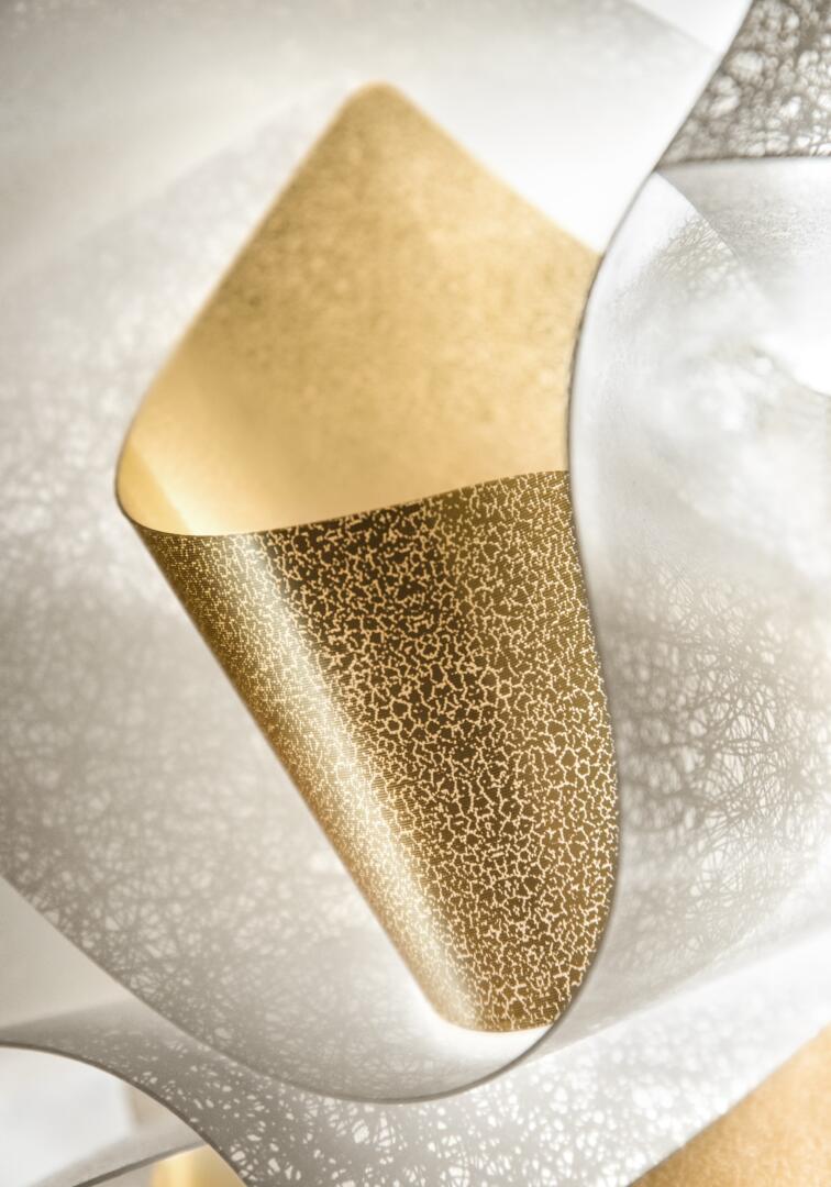 Die Veli Aurea Decken- und Wandleuchten, entworfen von Adriano Rachele zum 30-jährigen Jubiläum von Slamp, repräsentieren ein Stück moderner Kunst. Diese Sonderedition ergänzt eine ikonische Lampenkollektion, hergestellt aus avantgardistischen Technopolymeren (Opalflex® und Lentiflex®), mit einer weissen Textur und goldenen Lamellen. Diese Leuchten vereinen elegantes Design mit funktionaler Beleuchtung, bieten eine luxuriöse und warme Atmosphäre durch ihre wellenförmige Gestaltung und goldene Farbe. Vielseitig einsetzbar, sowohl als Decken- als auch als Wandleuchten, passen sie sich verschiedenen Stilrichtungen an. Moderne Beleuchtungstechnologie sorgt für gleichmäßiges, blendfreies Licht und einfache Installation. Die Veli Aurea ist die perfekte Wahl für stilvolle und effiziente Beleuchtung, die Raum mit Innovation und zeitlosem Design erfüllt.