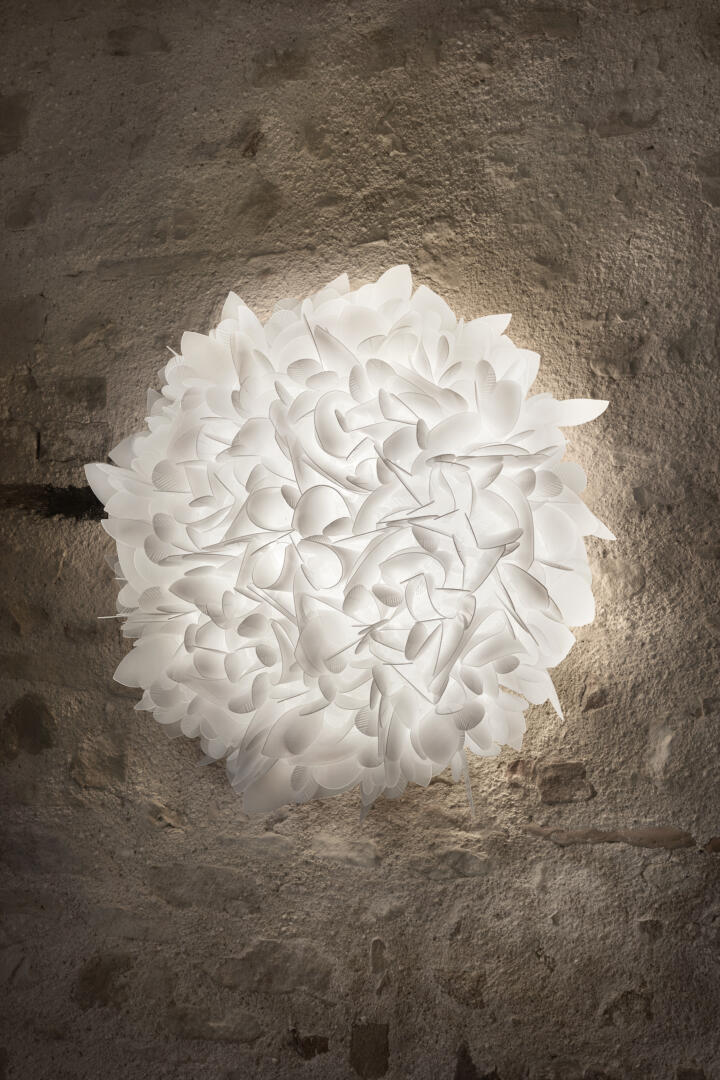 Hergestellt mit 268 vollkommen von Hand ausgeführten Steckverbindungen ist die Kollektion eine Verbindung zwischen der Weichheit der Welt des Schneiderns und der Perfektion der Natur. Die Veli Wand- / Deckenleuchte hat eine weiche Oberfläche, die von modernen Stoffstrukturen inspiriert wurde. Sie füllt und umhüllt jeden Raum und hebt ihn durch Ästhetik und üppige dekorative Eigenschaften hervor. Sie kann auch gut mit der Pendelleuchte aus der gleichen Serie kombiniert werden.